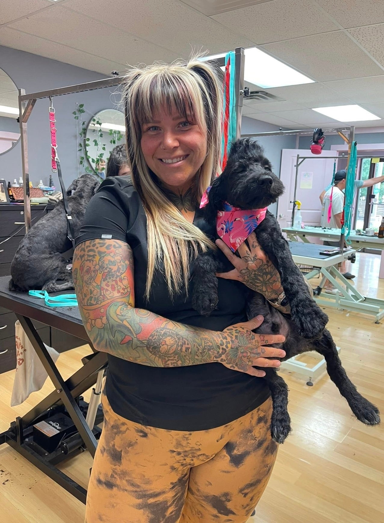 Before I started grooming, I was a kennel attendant and vet tech for many years . So I had a lot of behavioral dog and cat background . My career started back in 2012 when I worked for corporate, and that suit and tie life was not for me . I liked creative grooming and grooming senior dogs and dogs with behavioral issues, and I was not able to do any of that there . When I left, I noticed not only was I mistreated but I was often taken advantage of, and all that seemed to matter was more dogs and more money . So I left and, spur of the moment, opened my own salon called Clipper Doodle Do. I outgrew my first salon and upgraded to 1,000 sq feet . I was very happy alone but noticed something about me that wasn’t fulfilled . I had a deep yearning to help other people get into the grooming industry that otherwise couldn’t pay thousands to train or had to take months off work to train. I created a grooming trade program during COVID when the world opened back up and businesses were asking me to train groomers because I was training dog groomers on the side to get more groomers in the area .