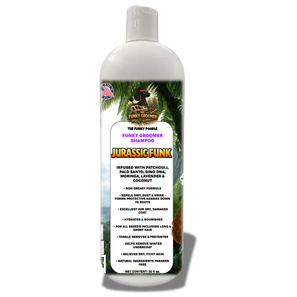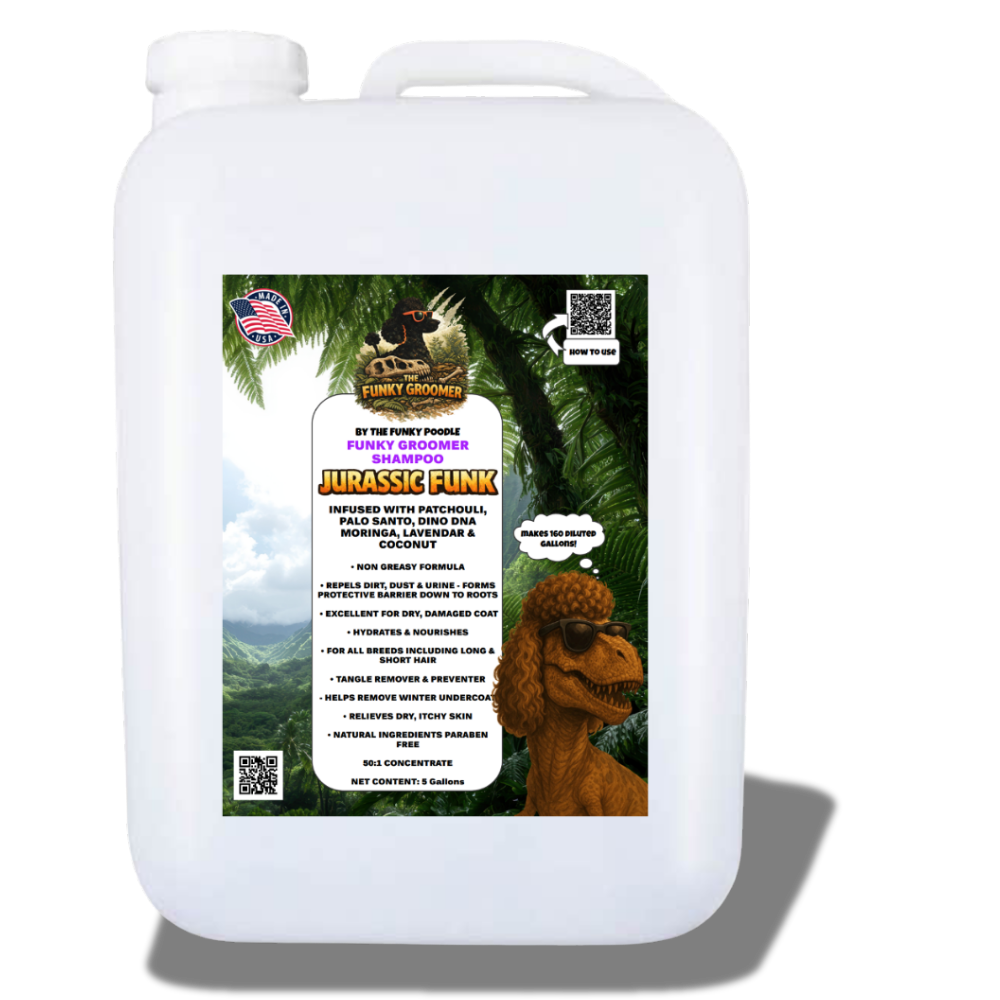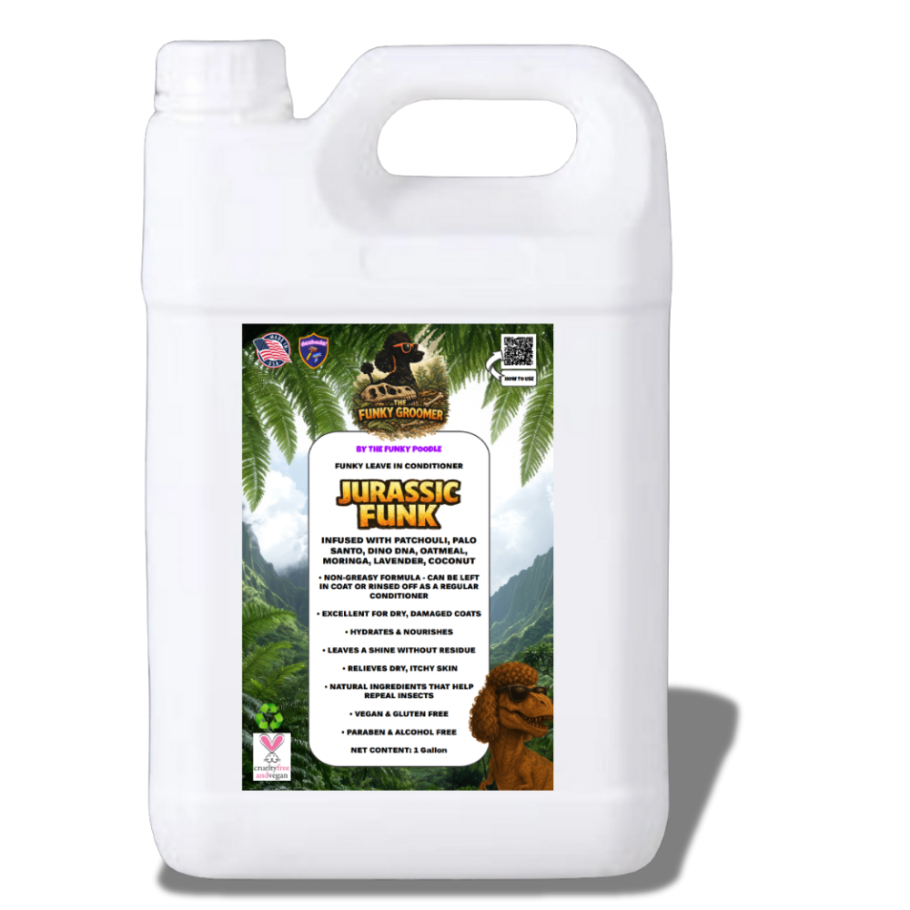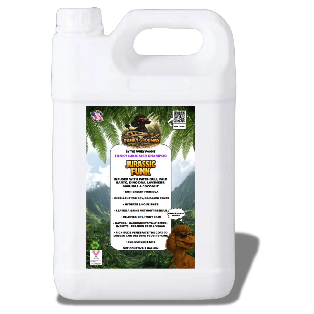 The Funky Poodle “Funky Groomer” Professional ABSOLUTE Concentrated Shampoo is lightly fragranced and highly concentrated, up to 50:1 ultra deep cleansing shampoo that removes the oils, grease, dirt, and stains from the coat. Leaving the coat looking funky fresh, healthy and smelling good. A great shampoo for everyday use and grooming. Completely safe to use at full concentrate.